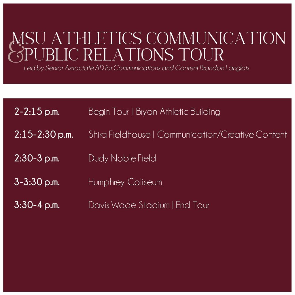 Students, we are excited to offer an additional opportunity to network and learn while on campus at Mississippi State. This tour will offer a unique, behind-the-scenes look at what communication professionals are up to with MSU athletics.
